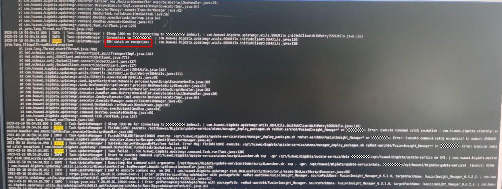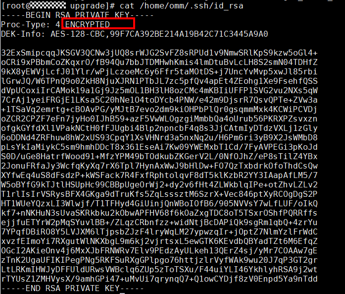 分析:DeployPakcageByplatform失败,查看日志:/var/log/Bigdata/update-service/runlog/update-manager.log。日志打印ERROR:SSH catch anexception,此报错为互信问题,手动测试互信没有问题,查看omm用户的ssh密钥文件,发现生成的密钥文件没有加密字段,8.x版本manager强制使用加密密钥,需要重建互信