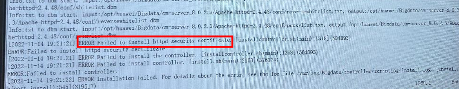 分析:DeployOMServer步骤失败,查看/var/log/Bigdata/upgrade/upgrade.log,报错:ERROR: Failed to install httpd security certificate。