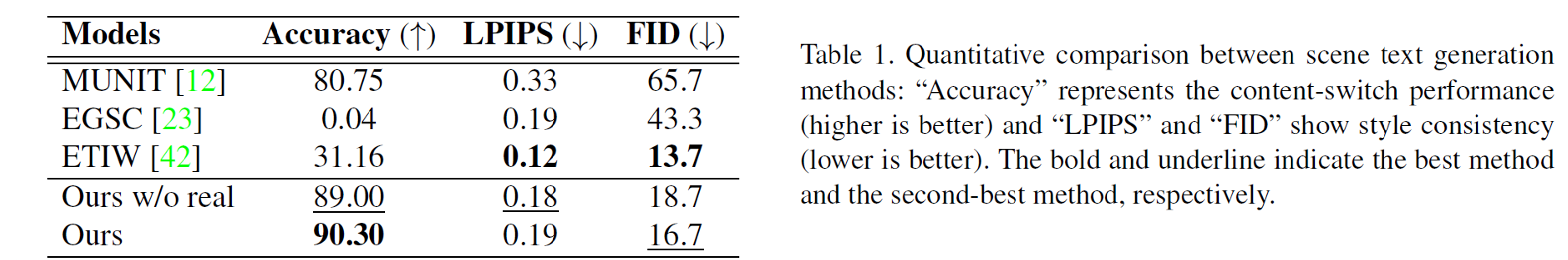 文本使用的评估指标有三个。首先是识别正确率,即引入训练好的识别器来识别已编辑的文本图片,得到其准确率。一般而言准确率越高越好,但是如果模型单纯地复制目标文本图片,识别正确率也会很高。另外两个指标LPIPS和FID都是衡量两张图片的相似度,这两个指标越低则两张图片的相似度越高。在文本编辑任务评估时,由于真实文本行图片是没有gt的,所以我们直接对比已编辑图片和原始风格图片的相似度,以衡量两张图片的风格相似度。但是如果模型简单地复制了风格图片时,这两个指标会很低。因此在评估文本编辑模型时,需要结合这三个指标一起参考。