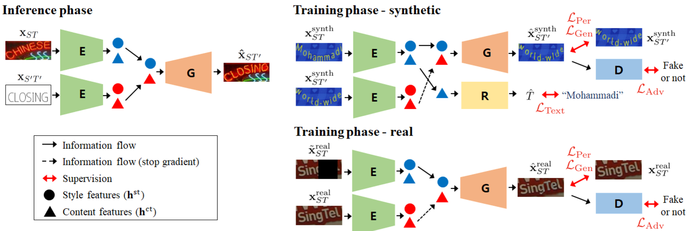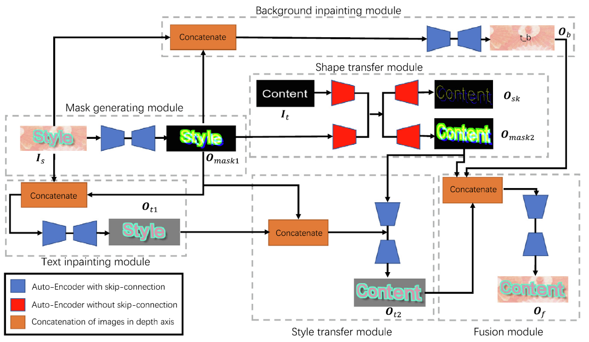 在这之前关于场景文本编辑的方法主要分为文本删除和文本转换两个阶段。文本删除将风格图片中的文本擦除掉,只留下背景;而文本转换模块先将目标文本迁移到风格图片中文本的样式,再将其与文本被擦除的背景进行融合,得到编辑好的图片。由百度提出的SRNet就是基本遵照这个pipeline,由背景擦除模块、文本风格迁移模块和融合模块组成;由华南理工大学提出的Mask-guided GAN则在文本风格迁移时考虑了文本的边框和阴影,生成的mask分为了文本、边框和阴影三个部分,其基本结构仍是前面提到的两个阶段。上述两阶段的方法除了推理速度较慢外,模型的训练也需要很多pair的数据,例如擦除、风格迁移和编辑前后pair的数据等,这些数据在现实场景中很难得到,因此上述的方法通常都是只用合成数据进行训练的。合成数据与真实数据之间的gap也导致了模型在编辑真实场景文本时效果不佳。