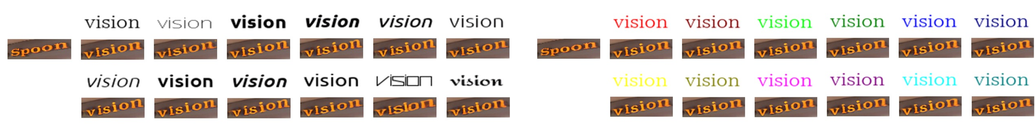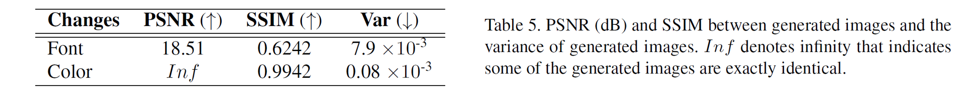 在第二个实验中,作者验证了目标文本图片中文字的风格变化是否会影响被编辑文本的风格。测试的三个指标均为比较不同生成图片之间的相似度。从可视化图片可以看出,目标文本图片中文字颜色的变化对生成图片的影响很小,而文本的字体会有较小的影响。我个人的猜想是RewriteNet中的文本内容编码不是完美的,仍然会保留一定的风格信息。而在训练时目标文本图片和生成的图片是一致的,因此生成器会参考内容编码的一些风格特征生成图片。