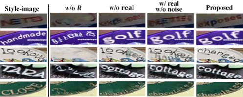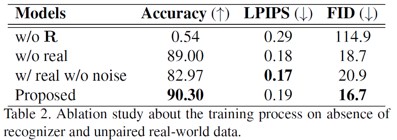 第三个实验是消融实验,作者先尝试去掉模型的识别器,则文本内容编码器完全无法训练;在训练时去掉真实数据时模型的性能不如原本的模型;而在真实数据训练时去掉黑块时,模型会趋向于直接复制风格图片,因此LPIPS和相对较高而识别准确率会降低不少。(图注:w/o R: training without recognizer, w/o Real: training without real data, w/o Noise: the input of style encoder is the raw image instead of the image with black block.)
