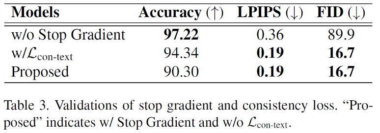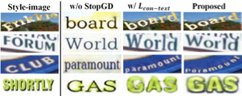 在设计选择的实验中,作者尝试了在训练风格编码器、生成器和鉴别器时不冻结文本内容编码器,即表格中的Stop Gradient一项,生成的图片几乎和目标文本图片一致。同时,作者还尝试加入了一致性损失函数进行训练,即将生成的图片用于识别器的训练。从指标上看,识别正确率要比原来的模型要好,但是作者通过可视化图片发现加入了一致性损失函数训练后,模型会破坏掉背景中其他文本的干扰。