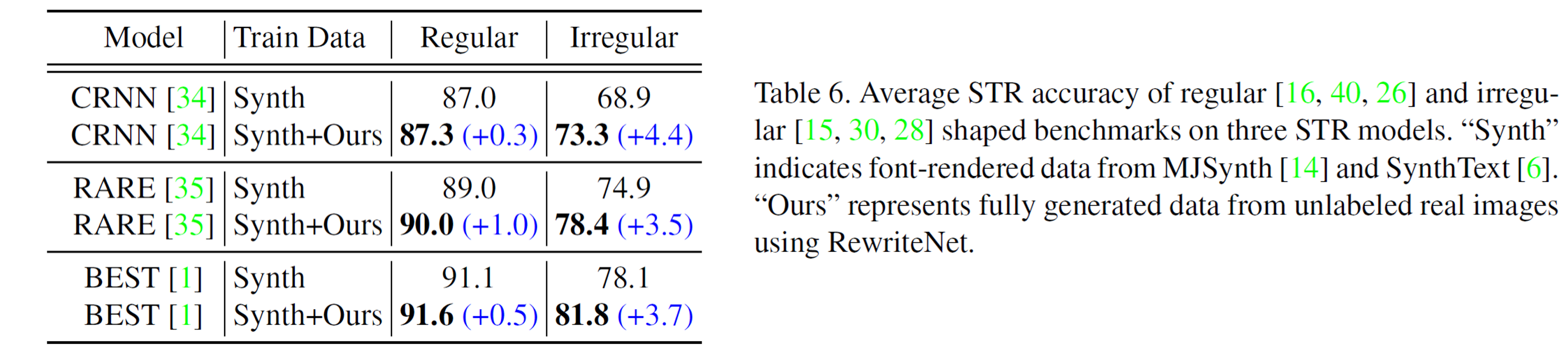 最后的实验是使用不同文本编辑模型合成文本行合成数据进行识别器训练实验。传统合成的数据在加入了RewriteNet合成的数据后性能都有了一定的提升,而在加入其他文本编辑模型合成的数据训练后,识别器性能反而下降了。这说明RewriteNet可以用于文本行识别数据的合成。