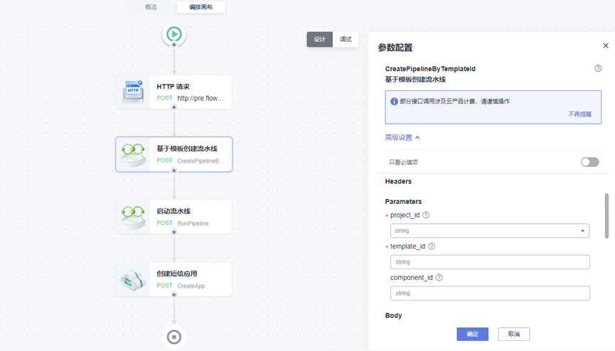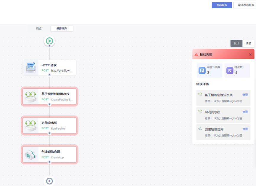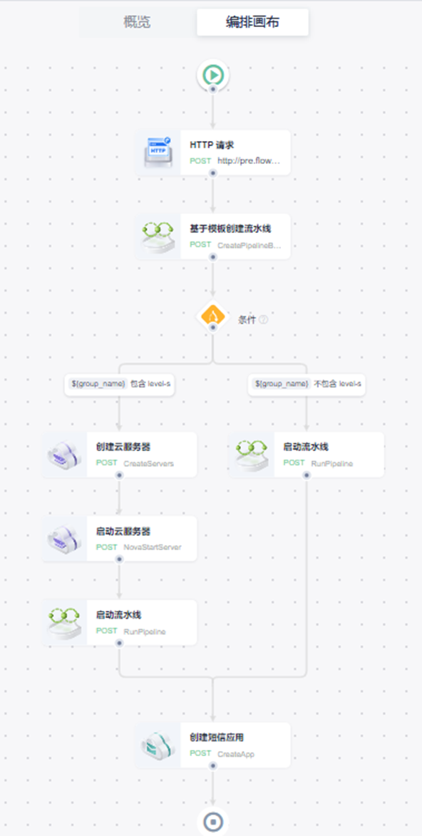经过分析,该场景下有创建游戏服务、流水线部署发布服务、查询玩家状态服务、发送短信服务等多个服务,其中基于华为云的服务有:流水线服务及发送短信服务。因此,小明便可以利用API编排快速设计流程。