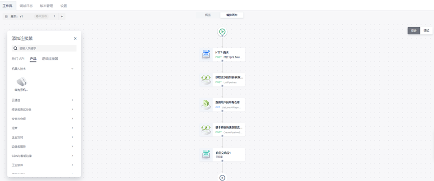 - 通过拖拉拽的方式,将华为云服务API连接器编排进工作流中,并进行调试