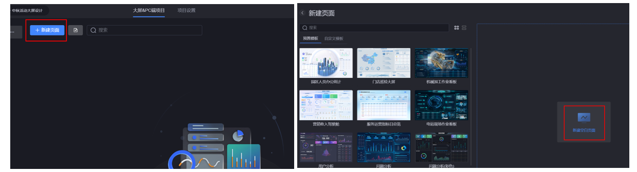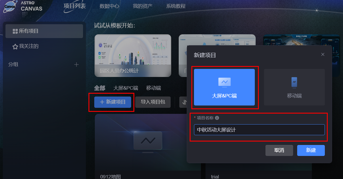 领取完成后,回到原页面,点击立即使用,然后新建项目,选择大屏&PC端,自定义项目名称。