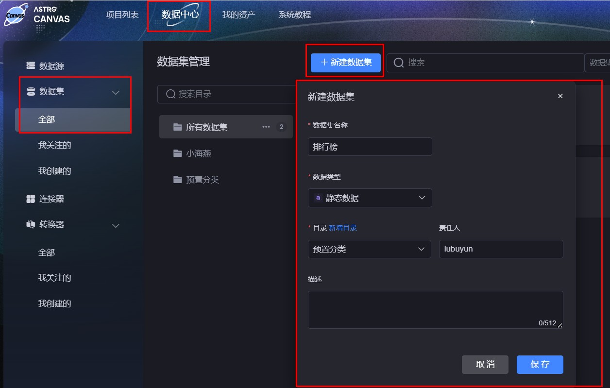 导航栏进入到数据中心,找到数据集>全部>新建数据集,输入相关信息。