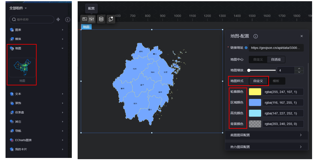 将左侧导航栏的地图组件拖到大屏上,点击地图组件上的配置按钮,对地图进行自定义配置,地图组件支持上传GeoJSON格式的地图数据(包括链接和素材两种方式)。