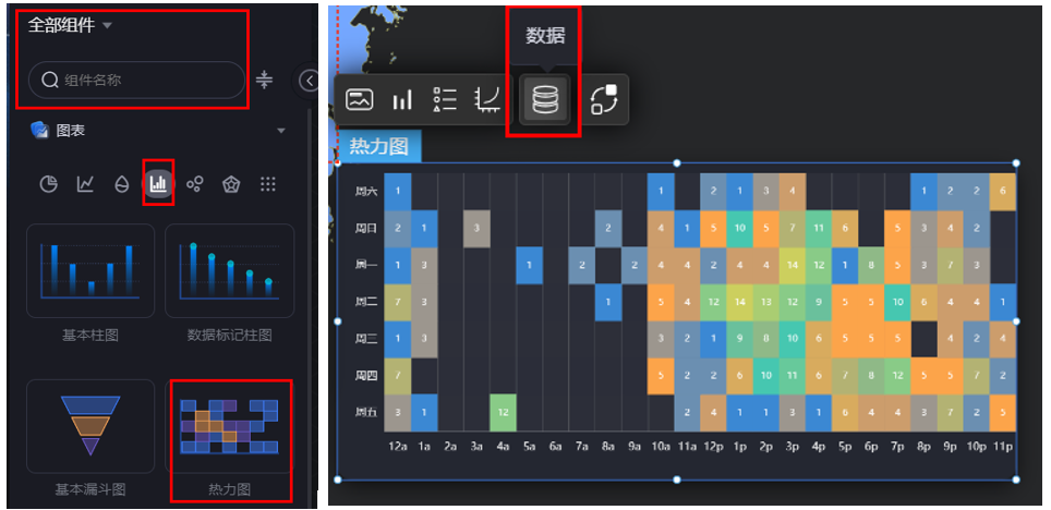 我们用热力图来完成近10年的节日活动出行轨迹图。找到左侧全部组件>图表>柱状图>热力图,将热力图组件拖到画布。点击热力图上的数据配置项,导入我们之前上传的活动轨迹数据集。