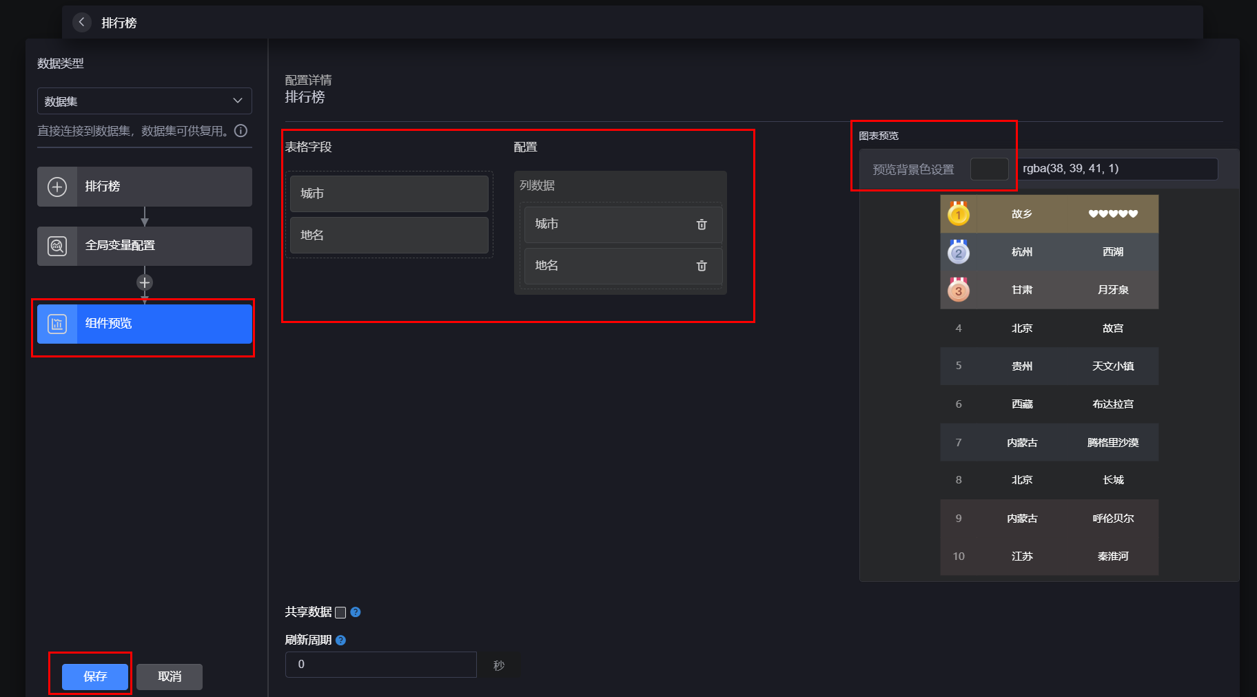 在组件预览里面,支持对表格字段进行配置,将左侧表格字段的城市和地名拖到右侧列数据。在图表预览里面可以看到数据变化,且可以对榜单的背景色进行设置。