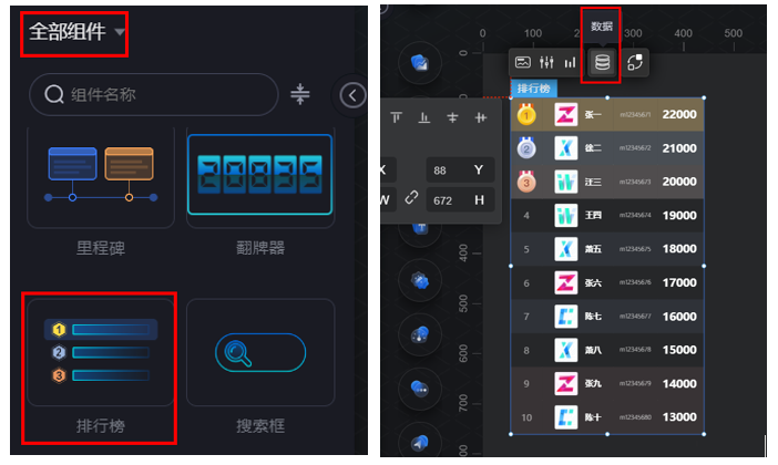 如果要给中秋最佳赏月地做个排行榜,可以选择全部组件>文本>排行榜,将排行榜组件拖到画布,然后点击数据,采用数据集导入数据。