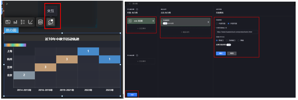 最后,我们可以设置热力图与外部页面的交互,实现点击热力图跳转到自己的社交主页功能,更好地展现精彩假期生活。