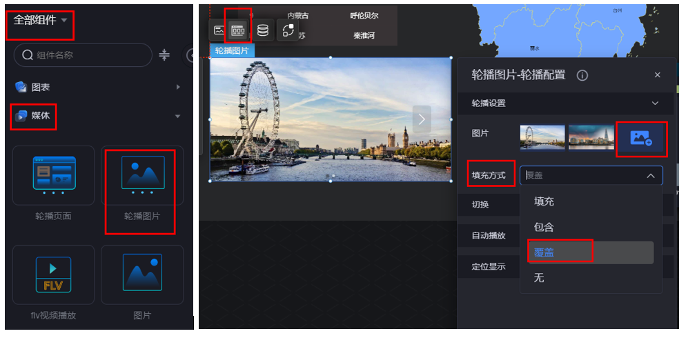 左侧导航栏找到全部组件>媒体>轮播图片,将轮播图片组件拖入画布。先设置填充方式,再上传图片,并按照自己的喜好选择对应的轮播方式(自动轮播/手动轮播)。