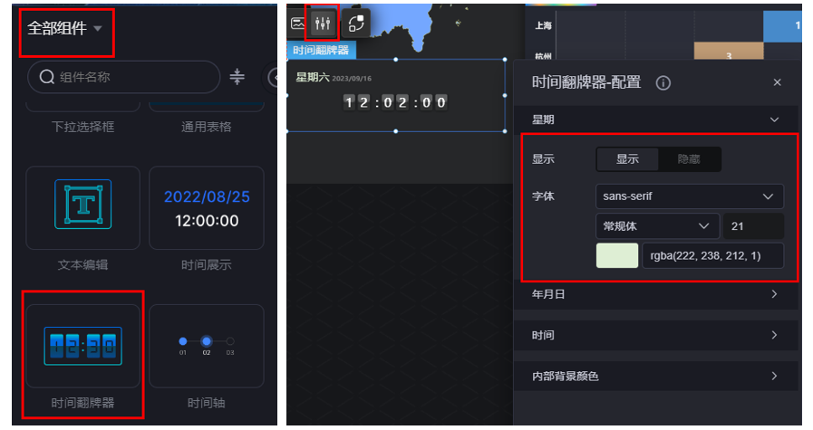 八天假期转瞬即逝,我们可以在大屏页面上添加实时日期和时间,实时显示自己的假期余额。找到左侧全部组件>文本>时间翻牌器,将时间翻牌器组件拖入画布进行设置,点击配置按钮,修改字体,大小,颜色等。