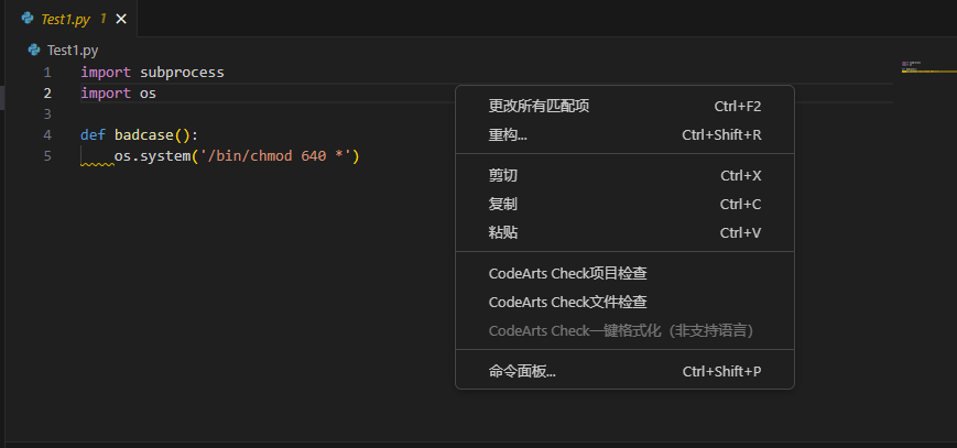 - 安装插件完成待依赖工具自动安装后,选择某个python文件或者目录右键菜单 选择“CodeArts Check文件检查”;