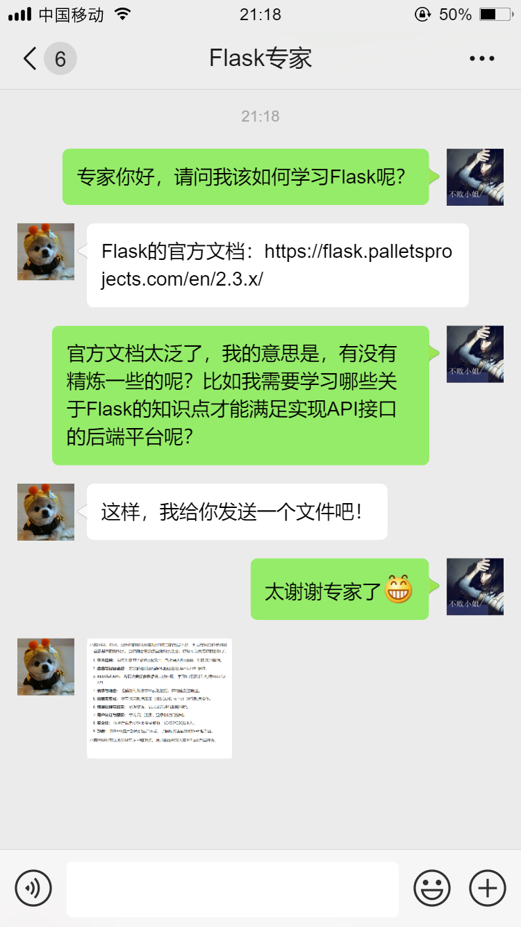接着,小菜找到了Flask这方面的专家,咨询专家应该如何去学习Flask,他们对话如下: