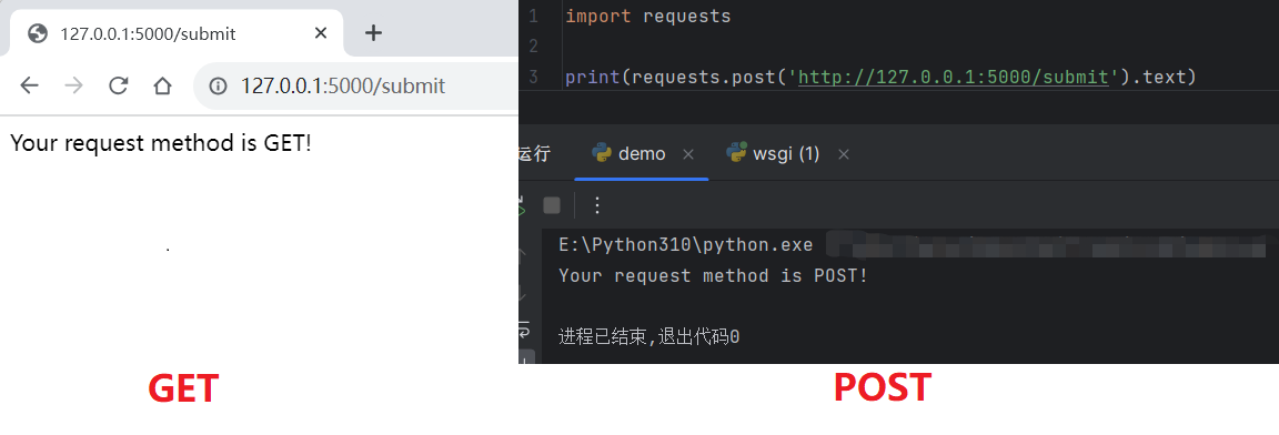 - 如果用户使用POST请求,视图函数将返回 "Your request method is POST!"