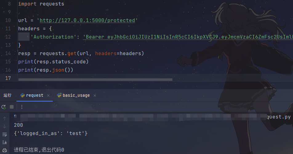 下面展示了用户如何使用 Python 的 requests 库来发送带有 JWT 令牌的请求,以获取受保护的数据: