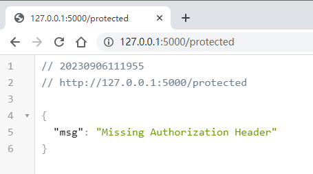 /protected路由,它是受保护的路由,只有在请求中包含有效的JWT令牌时才能访问。这是通过@jwt_required()装饰器实现的。- 如果请求中没有有效的JWT令牌,访问该路由会返回未授权的响应。