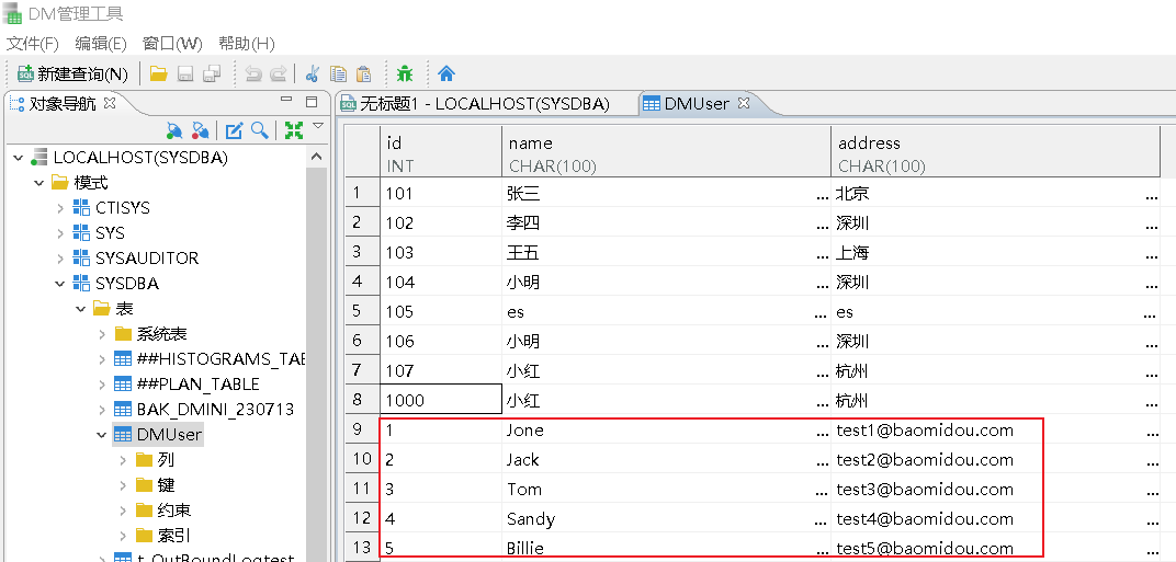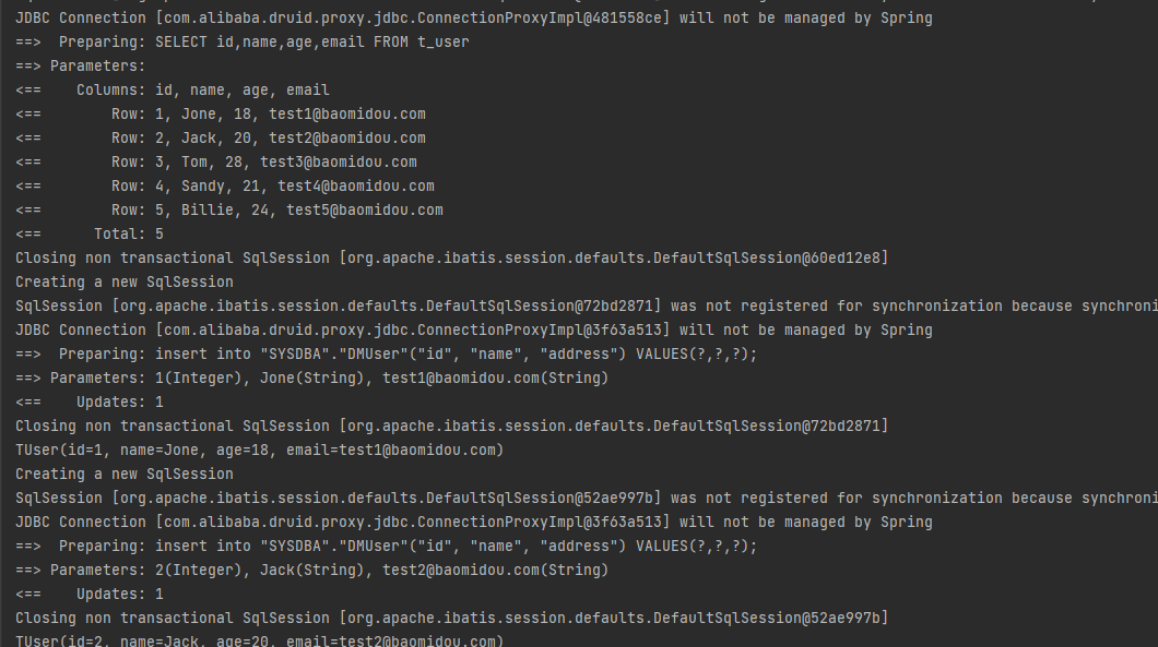 <select id="selectDmUserAll" resultType="com.example.domain.Dmuser">select "id","name","address"from "SYSDBA"."DMUser";</select>
