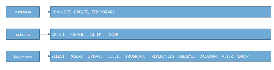 1.数据库database、schema、table/view各个对象包含的权限如下图所示: