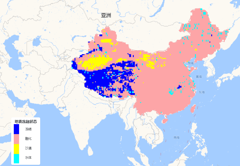 分类结果包含冻结地表、融化地表、沙漠及水体四种类型。数据覆盖范围为中国大陆主体部分,空间分辨率为25.067525 km,EASE-Grid投影方式,以ASCIIGRID格式存储。