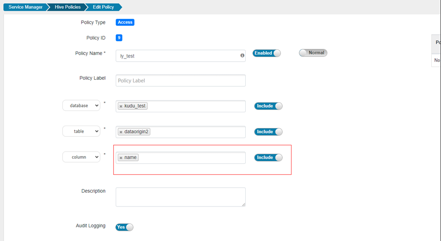 4.新增策略,针对不同的database和table,column设置访问策略(column为*表示所有列),并配置需要按改策略访问的用户