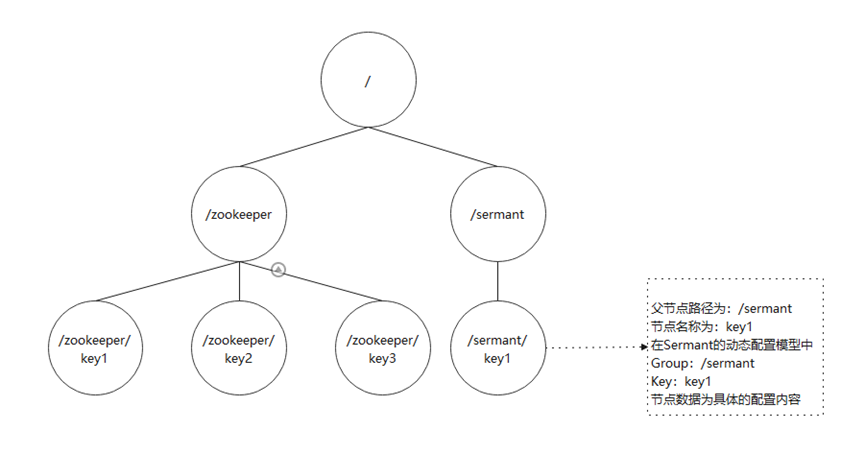 Key(配置项名称):Znode节点的节点名称作为配置项的Key,节点数据作为具体的配置内容。