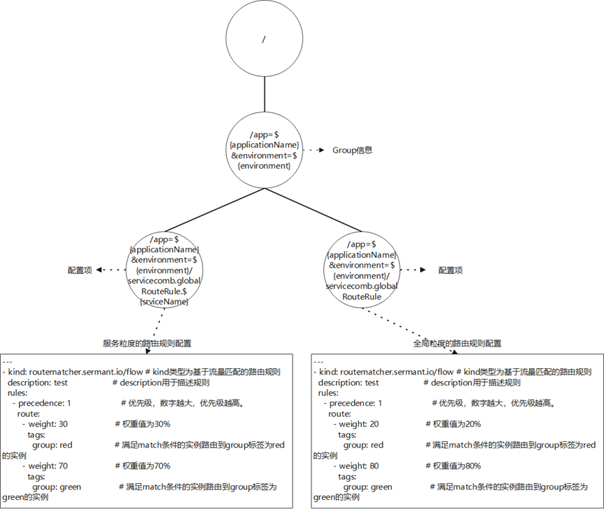 通过标签路由插件基于Sermant动态配置模型的实现我们可以看出,Sermant动态配置模型的Group(分组信息)支持基于应用名称和环境名称生成,此时针对于单个微服务应用只需要创建一个Group(分组信息),可以避免创建过多的的Group(分组信息)。Sermant动态配置模型的Key(配置项名称)支持基于微服务场景和服务名称生成,此时可以针对单个服务、也可以针对所有服务进行动态配置,保证单个实例不需要监听多个配置项,避免监听多个配置项导致服务性能下降、配置更新不及时或者配置冲突等问题。