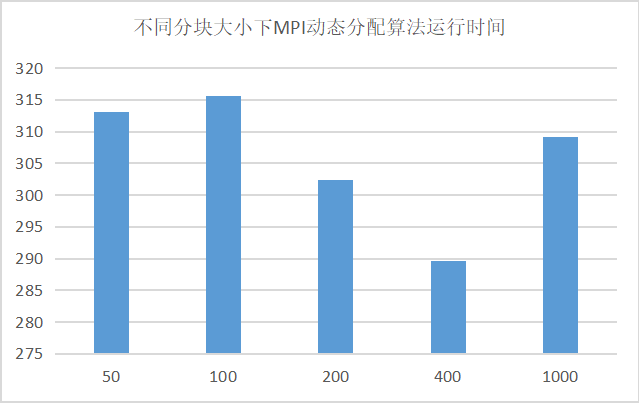 结果分析:可见在本实验条件下,块大小对MPI动态任务分配算法的运行时间是有影响的,在块大小为400时,时间效率达到最高值。因此选择合适的分块大小有助于提高MPI动态任务分配算法解决该问题的运行效率。