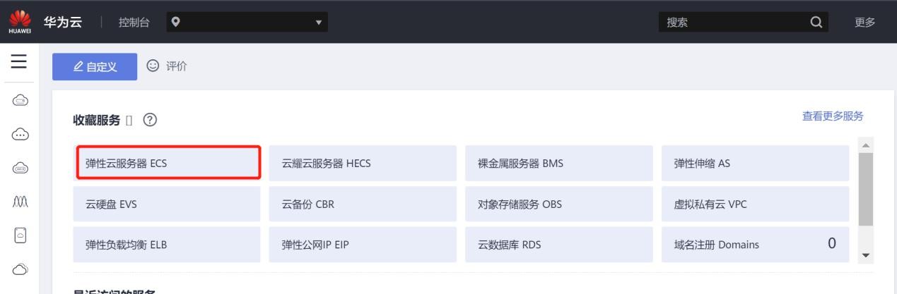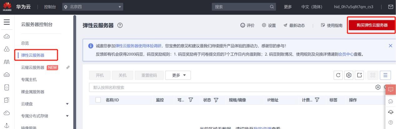 点击界面左侧的“弹性云服务器”,再点右侧“购买弹性云服务器”: