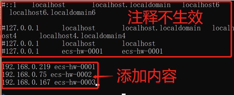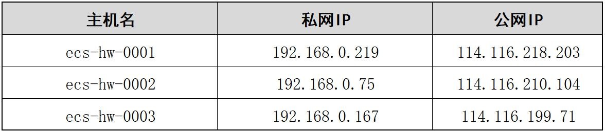 ecs-hw-0001, ecs-hw-0002, ecs-hw-0003, 三台机器的私网 ip 为 192.168.0.219, 192.168.0.75, 192.168.0.167。环境配置时在每一台主机上 都需要重复执行,步骤