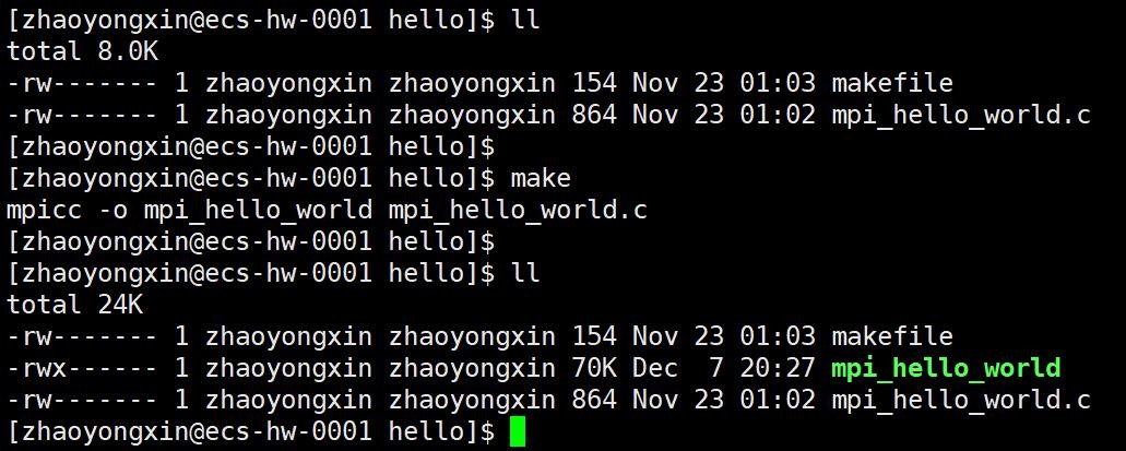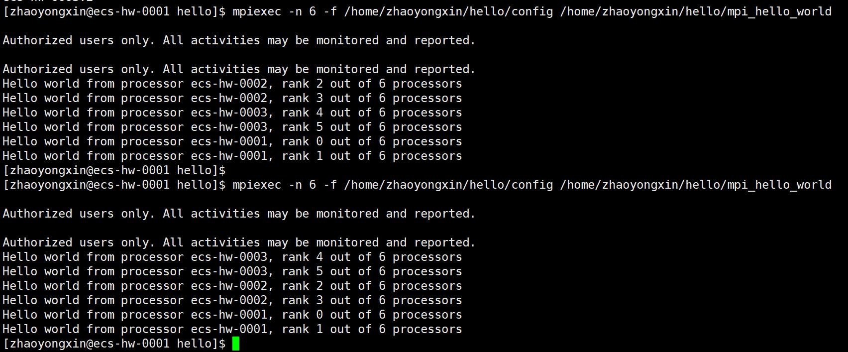 通过上述代码运行,可以看出,编写的 hello-wolrd 程序已经在华为鲲鹏上运行起来,程序在集群之间并行计算处理。