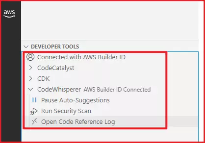 与此同时,VSCode 左下角开发者工具(DEVELOPER TOOLS)也已经显示链接到 Builder ID。至此,我们的前置工作已经全部完成,下面可以开始进行工具使用。