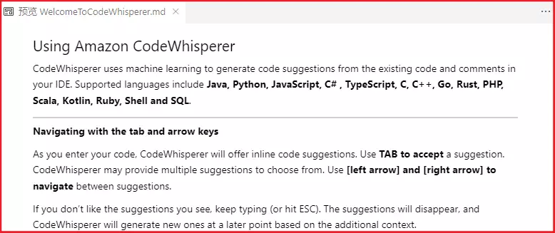 返回到 VSCode 中,会发现 Amazon CodeWhisperper 帮助手册已经打开,建议阅读一下 ,里面已经整理了插件的基础使用说明。