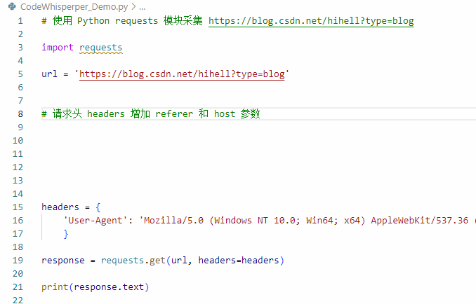 单独的案例对 CodeWhisperer 已经没有难度了,接下来我们尝试完成一个完整的 Python 爬虫案例(咱们看一下只写注释,能不能完成一个合格的爬虫采集程序)。