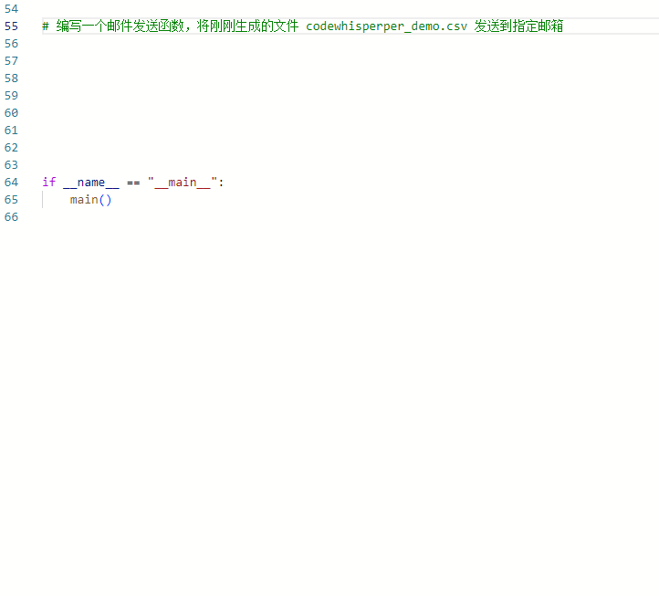 输入注释:# 编写一个邮件发送函数,将刚刚生成的文件 codewhisperper_demo.csv 发送到指定邮箱,CodeWhisperer 瞬间就会帮助我们生成一个参考函数,实际效果如下图所示。