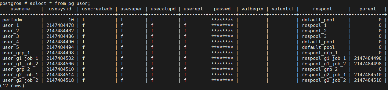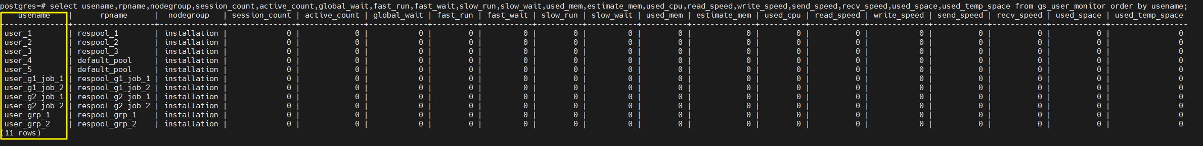 select usename,rpname,nodegroup,session_count,active_count,global_wait,fast_run,fast_wait,slow_run,slow_wait,used_mem,estimate_mem,used_cpu,read_speed,write_speed,send_speed,recv_speed,used_space,used_temp_space from gs_user_monitor order by usename;