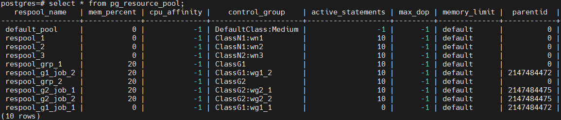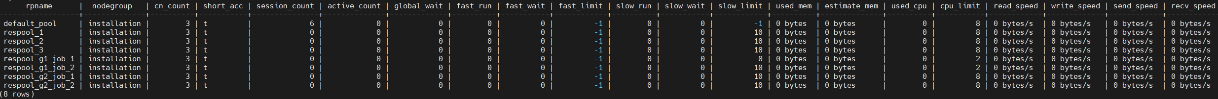 select rpname,nodegroup,cn_count,short_acc,session_count,active_count,global_wait,fast_run,fast_wait,fast_limit,slow_run,slow_wait,slow_limit,used_mem,estimate_mem,used_cpu,cpu_limit,read_speed,write_speed,send_speed,recv_speed from gs_respool_monitor order by rpname;