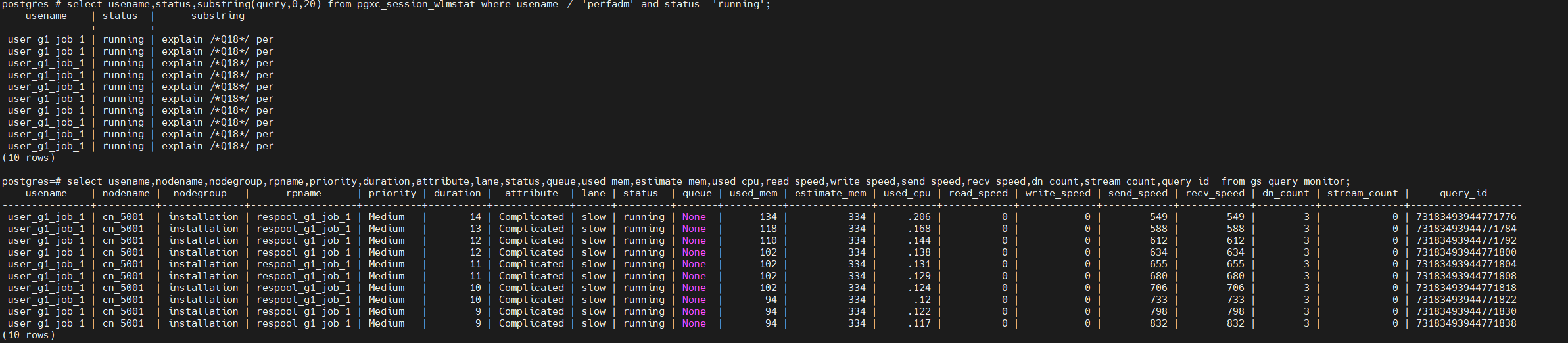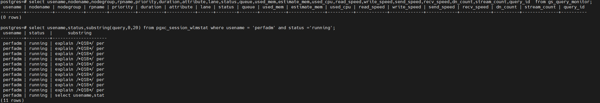 select usename,status,substring(query,0,20) from pgxc_session_wlmstat where usename = 'perfadm' and status ='running';