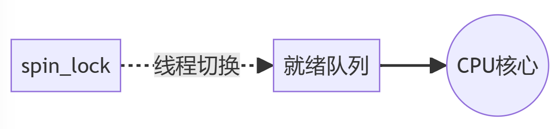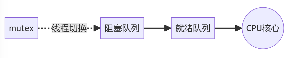 互斥锁中如果一个线程发现锁以及被占用了,那么会进入阻塞等待,会引起线程切换,线程进入阻塞队列;当锁释放了,阻塞队列会取出一个阻塞线程加入就绪队列,等待CPU调度。