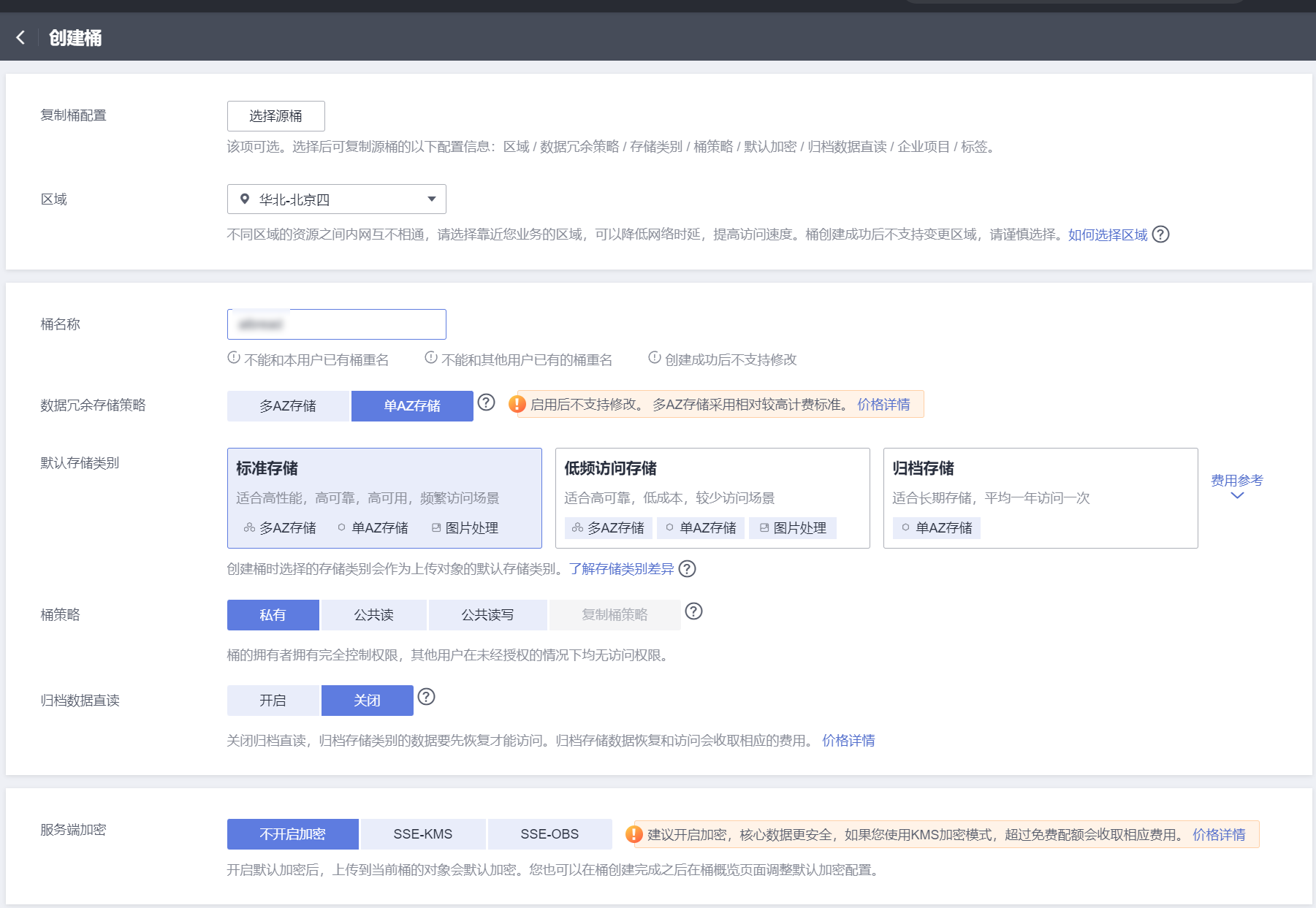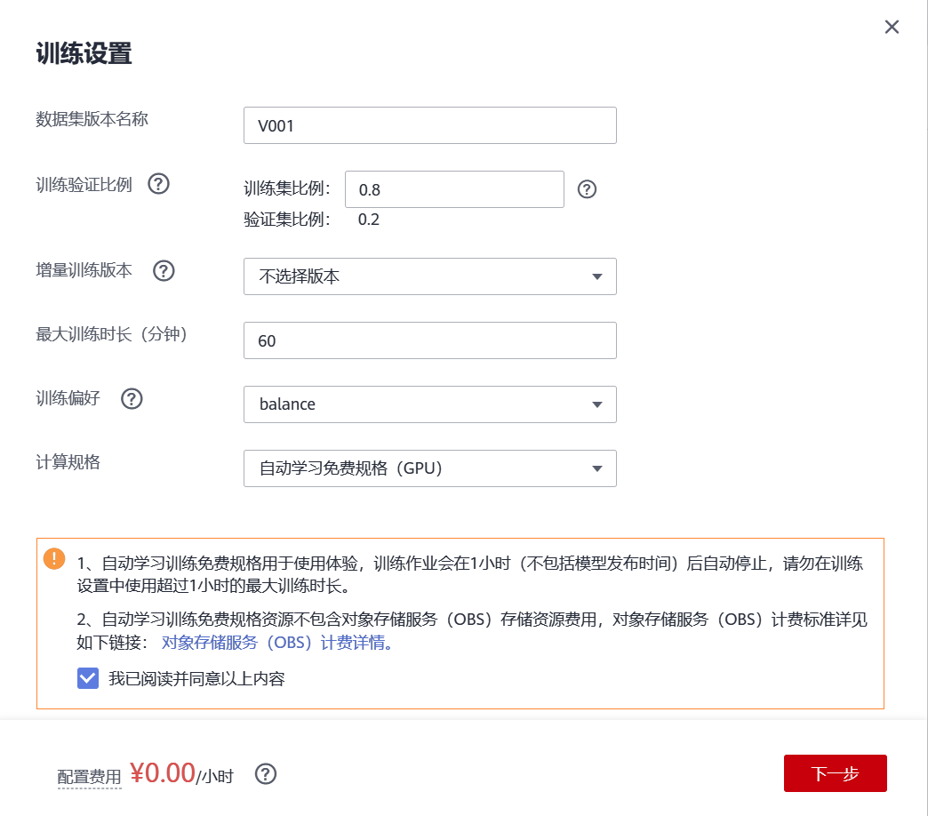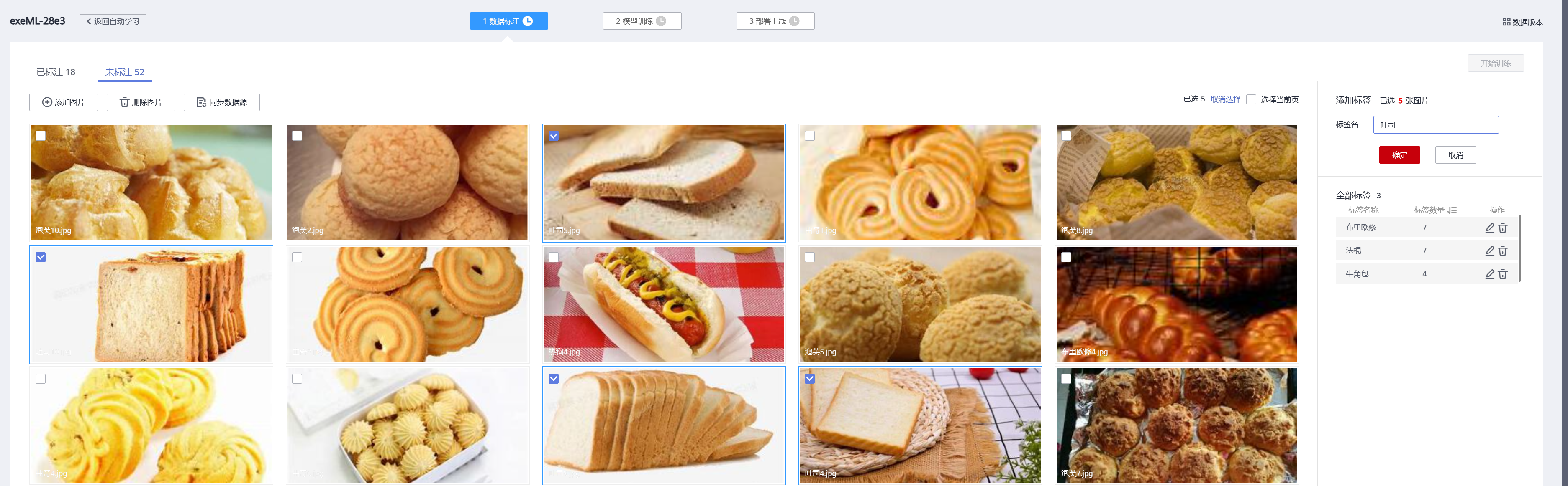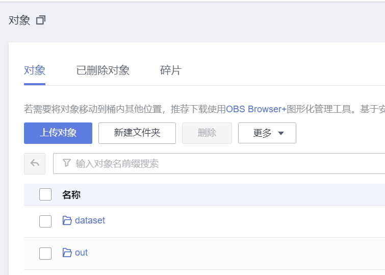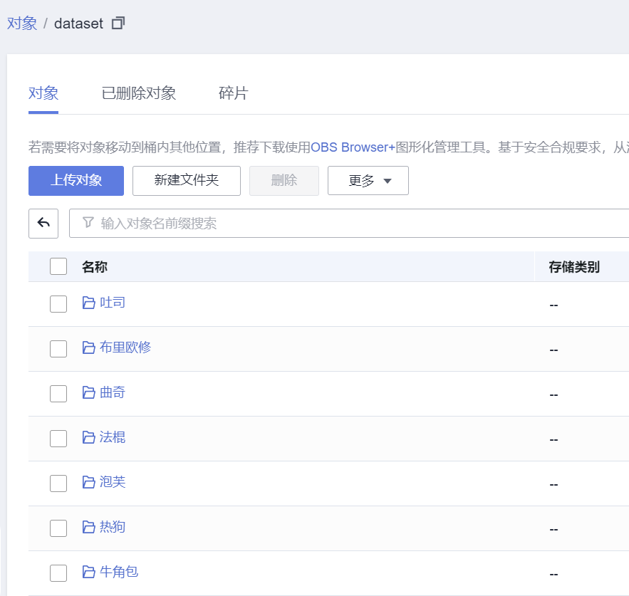 在测试中,本人准备了共计7个种类的面包图像,每种面包10幅图像。在华为云OBS中,创建一个新的桶(默认配置,但选择单AZ存储以降低成本),在新建的桶中创建dataset以及out文件夹,而后将数据集上传至dataset文件夹中。