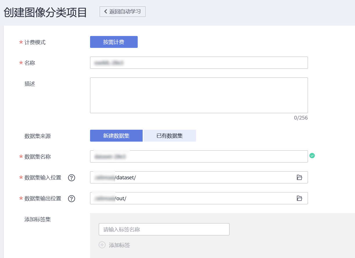 随后,进入华为云ModelArts中,进入“自动学习”功能(注意进入“旧版”界面),创建“图像分类”项目,对项目进行命名,选择新建数据集,数据集输入位置为OBS桶的dataset文件夹,数据集输出为out文件夹,随后点击创建项目。