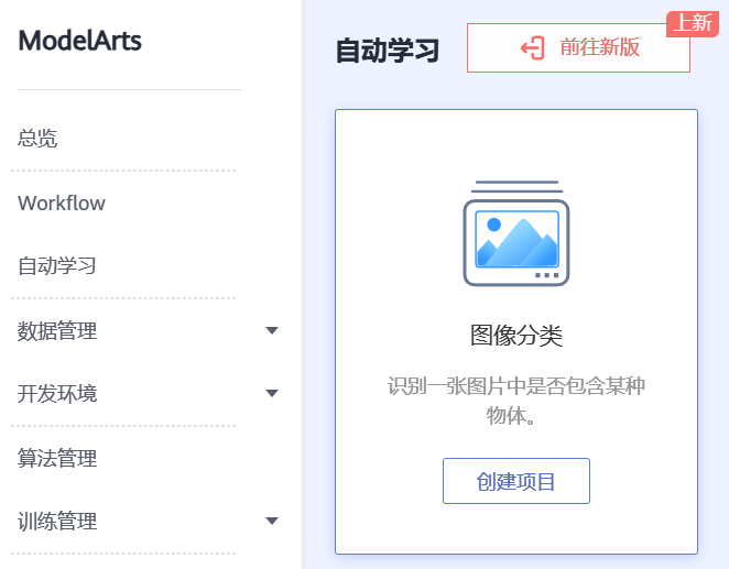 (左:自动学习界面中显示“前往新版”则说明目前处于“旧版”界面中;右:项目创建界面)