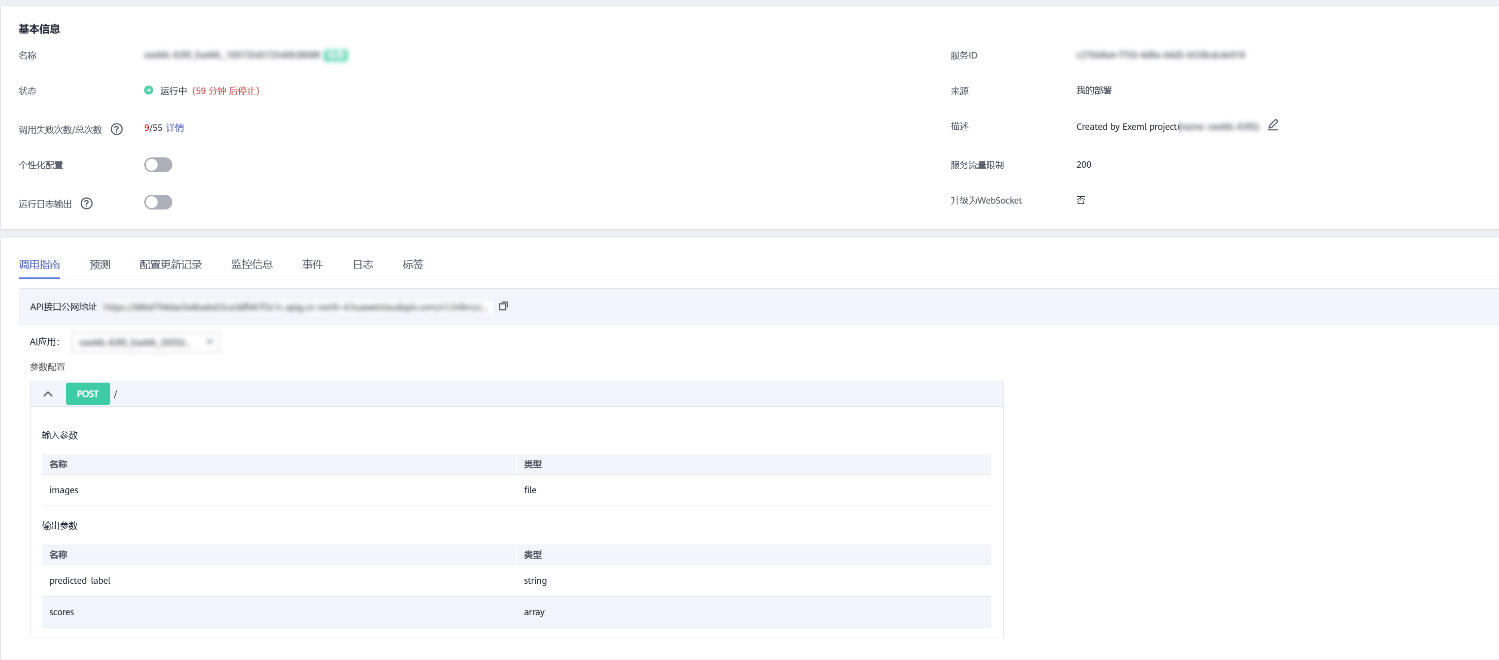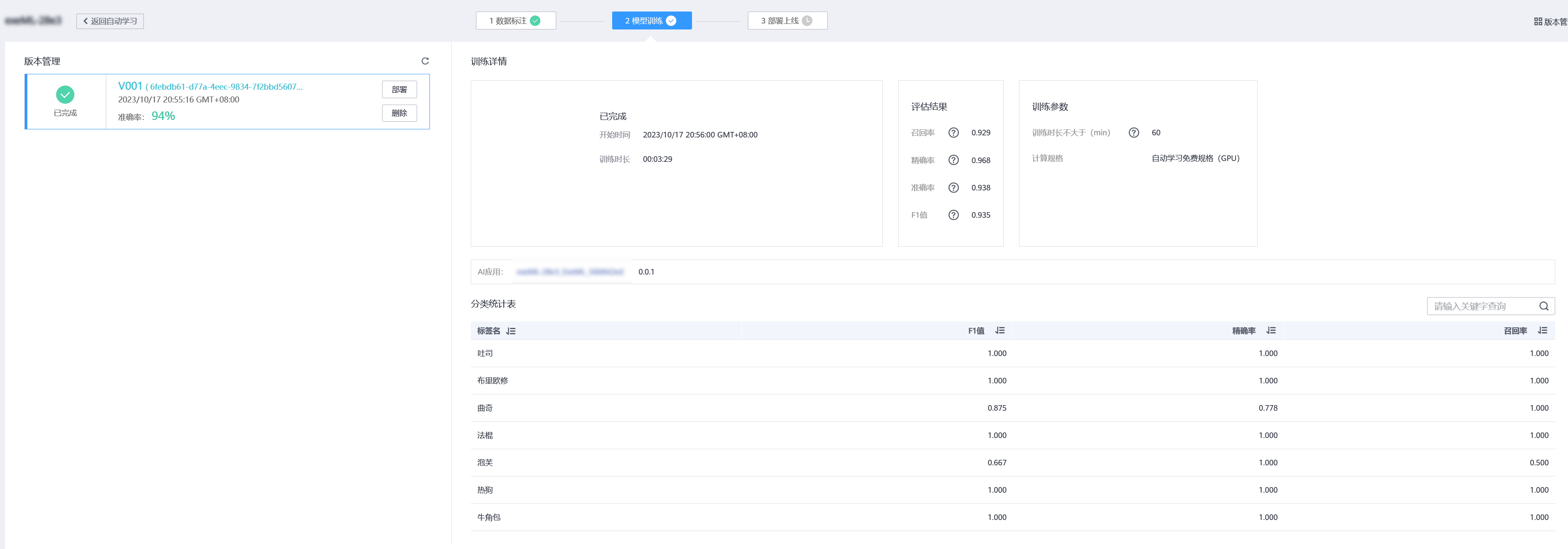 观察训练结果可知,模型准确率较高(约94%),可以直接应用。因此,点击“版本管理”中“V001”版本的“部署”,选择部署参数后,部署模型,等待模型部署完成后,即可使用。