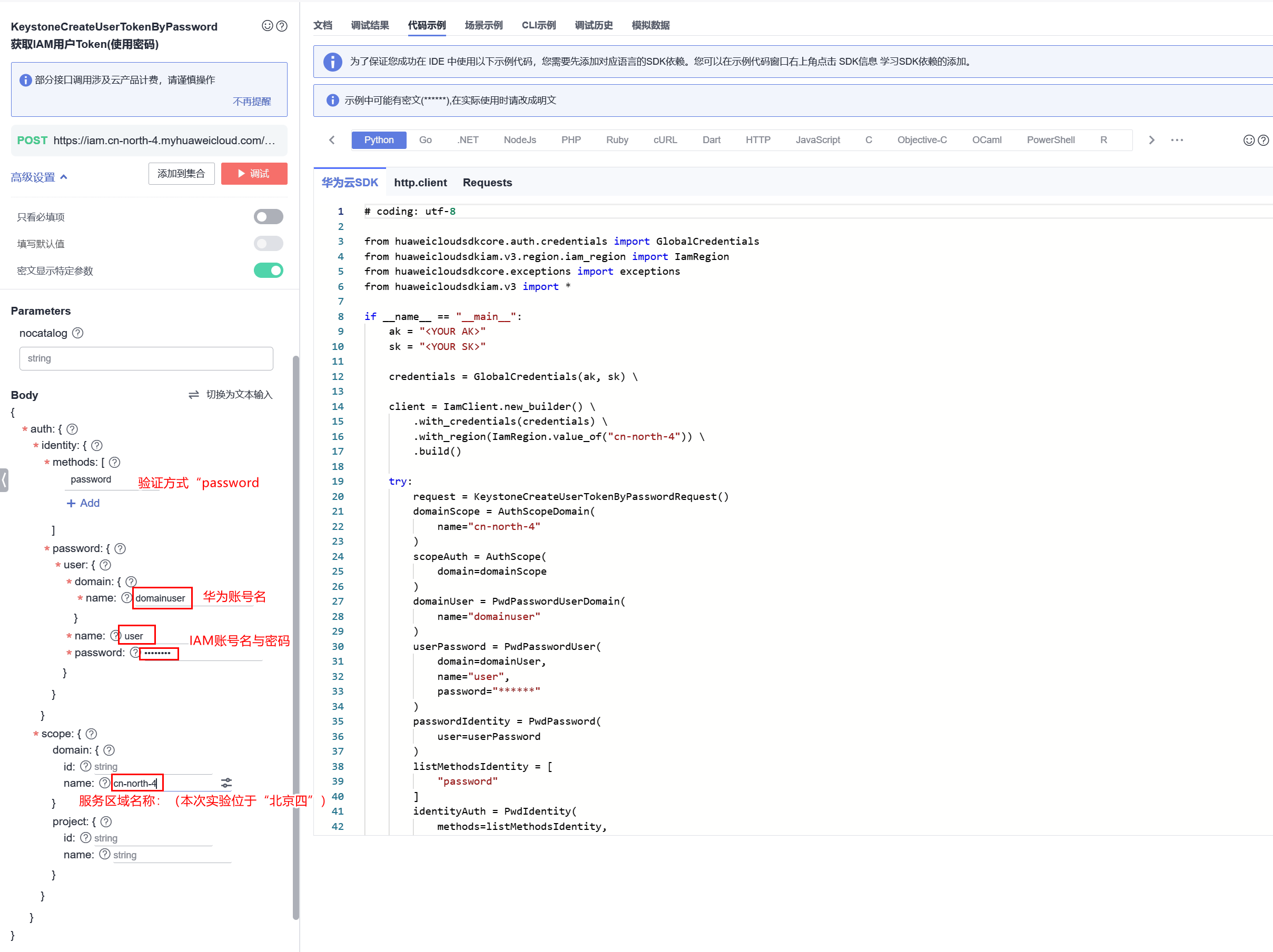在https://console.huaweicloud.cn/apiexplorer/#/openapi/IAM/sdk?api=KeystoneCreateUserTokenByPassword中填入自己的账号密码等信息先调试,并在“代码示例”下载相对应的python代码,填入IAM账号的“AK/SK”密钥(在账号“我的凭证”-“访问秘钥”中可创建并下载“AK/SK”密钥),即可在“response.x_subject_token”中查看到token信息(24小时内有效)。