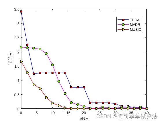 通过matlab对比music,mvdr以及tdoa三种定位算法的性能