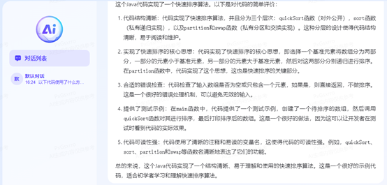 以上就是通过FuncGPT(慧函数)用Java写的一个快速排序算法的基本流程。当然,实际使用中,我们还需要考虑一些其他的因素,比如如何选择一个好的基准元素(这通常会影响排序的效率),以及在内存有限的情况下如何处理大型数组(这通常会影响程序的稳定性)。而这些,采用代码编写最佳实践及大规模机器联合训练的方式诞生的FuncGPT(慧函数)都已经帮你实现。我们将以上代码放到可以媲美ChatGPT—4的文心一言中,得到的评价是:这个Java代码实现了一个结构清晰、易于理解和使用的快速排序算法(详情见截图)。