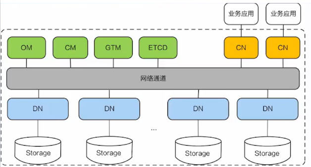 • DN 数据节点 (Data Node)。负责存储业务数据、执行数据查询任务以及向CN返回执行结果